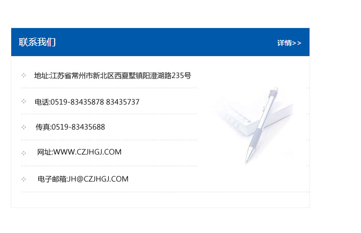 地址:常州市新北區友邦商務大廈1幢16、17層  電話:0519-85101652  傳真:0519-85112595  郵編:213022  網址:www.cz-jiayue_cn.b-honest.com  郵箱:xiajifengaa@163.com